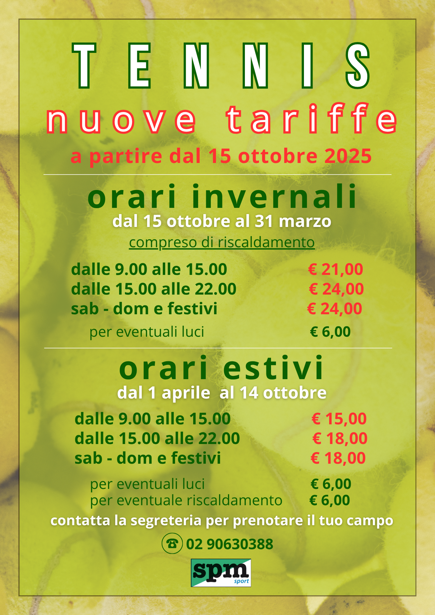 Gli orari disponibili per i campi da tennis sono dal Lunedì al Venerdì dalle 9.00 alle 22.00 e nel weekend dalle 9.00 alle 19.00.